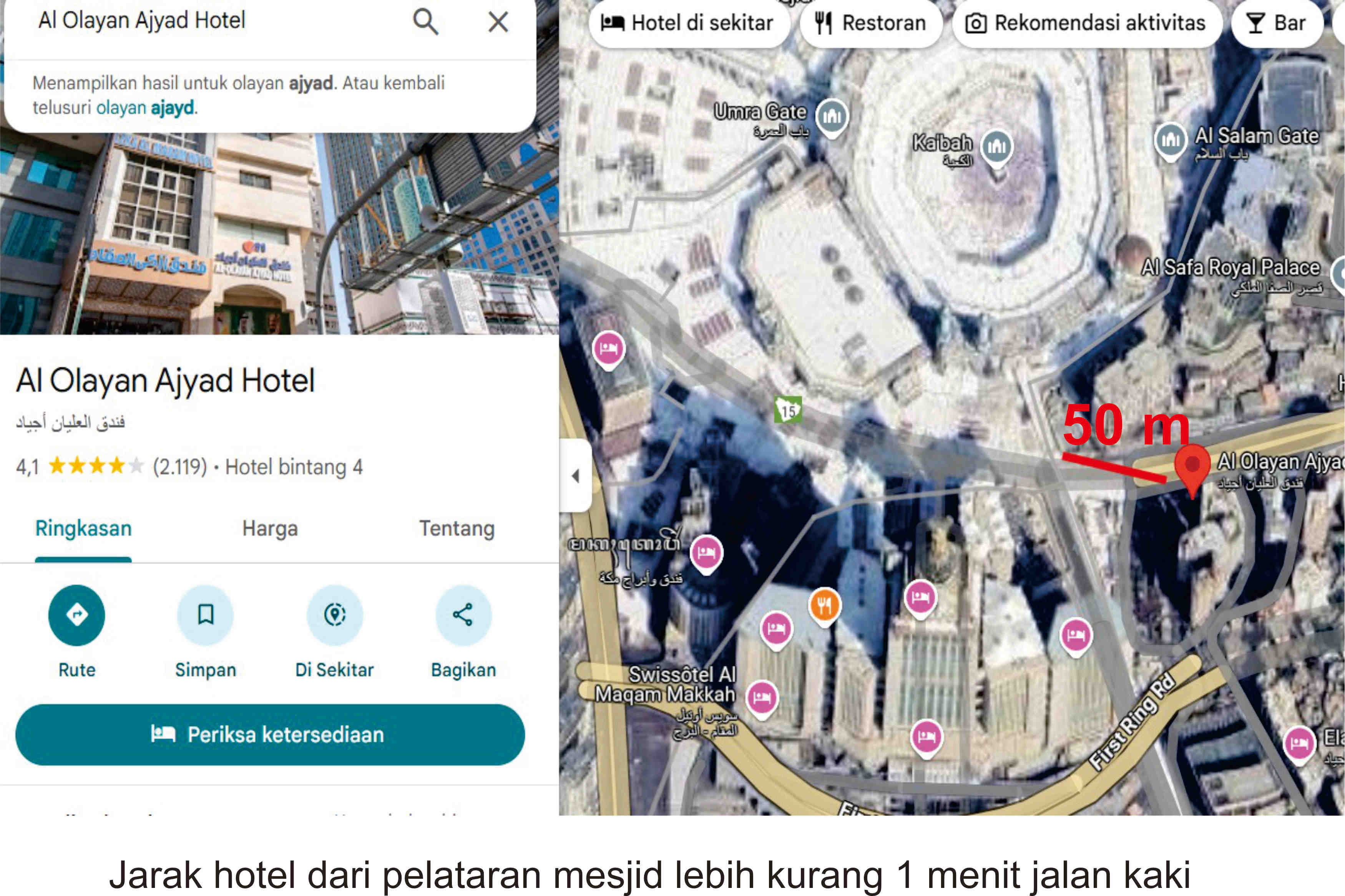 Bayangkan, hanya 1 menit dari hotel ke pelataran Masjidil Haram. Bapak/Ibu bisa bolak-balik ke masjid dengan tenang, tanpa harus merasa lelah atau kepayahan. Tak perlu terburu-buru, tak perlu takut tertinggal waktu salat—cukup melangkah sebentar, sudah sampai di rumah Allah. Karena kenyamanan saat ibadah itu bukan kemewahan, tapi kebutuhan, apalagi untuk Bapak/Ibu yang ingin fokus beribadah di usia 40–80 tahun.